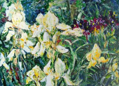 | Ik ging aan het werk en koos aanvankelijk voor mijn eigen interpretaties van Vincents bloementhema's. Als portretschilder waren bloemen voor mij een nieuwe uitdaging. Mijn keus viel in eerste instantie op de Irissen en de Bloesems. Op dat moment koos ik bewust niet voor de zonnebloemen. Naar Bloemthemas; |