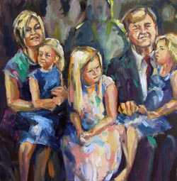 Rondom de Troonswisseling zijn overal in het land exposities. Het schilderij hiernaast is van de familie op bezoek bij het Fruitcorso. Dat moet hier in Zundert ook kunnen! <<Olie op paneel, 50/50 cm |