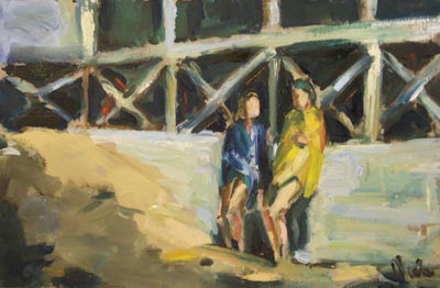 Metromeisjes Ubahn 1.1 Berlijn, olie op paneel |