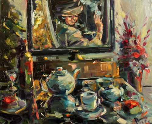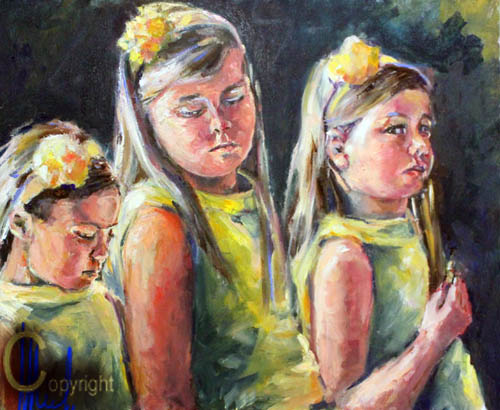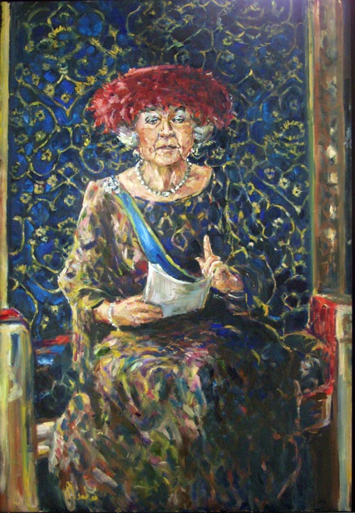 Waarom schilder je het koningshuis?Nou, om te beginnen: iedereen kent het koningshuis. Dus al een schilder wil bewijzen, dat ze gelijkende portretten kan maken, dan is dit de kans.Verder waren er op diverse momenten grote schilderwedstrijden, waarin het koninklijkhuis centraal stond. Ik hou wel van een uitdaging, maar ik pakte eea altijd net even anders aan, dan mijn collega's, die graag persfoto's schilderen. Daar ben ik niet zo van.Daarnaast houd ik er van de menselijke kant van iedereen te laten zien. Dus als ik een videootje tegenkomen, met een Sinterklaasliedjes zingend koninklijk gezin, ( dat ook nog eens prettig belicht is) dan trek ik daar materiaal van, en stel een schilderij samen.Het gezin op de tribunes van een corso trok me, als fervent liefhebber van het grootste Dahliacorso van Europa (zo niet de wereld) natuurlijk ook meteen aan.Heel speciaal vond en vind ik, dat de karakters van de drie dochters van meet af aan, te zien waren.