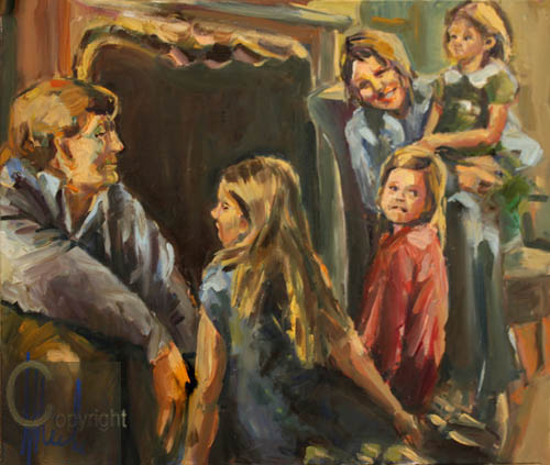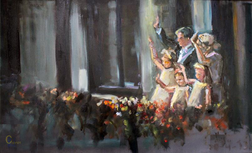 Zoals gezegd, had ik er plezier in, het gezin vooral als gezin te portretteren.De gebeurtenis op Kroningsdag was extra inspirerend. De gele jurkjes waren geweldig. De 'balkon scene'heb ik die dag 'live' ingezet en later tijdens de landelijke feestelijkheden in het openbaar verder afgewerkt in de Grote Kerk van Breda.