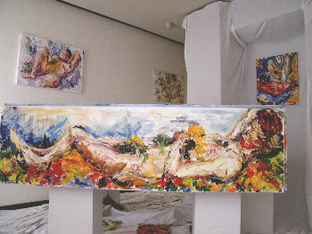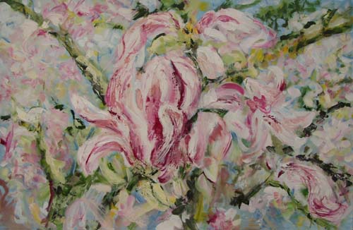 | Ik ging aan het werk en koos aanvankelijk voor mijn eigen interpretaties van Vincents bloementhema's. Als portretschilder waren bloemen voor mij een nieuwe uitdaging. Mijn keus viel in eerste instantie op de Irissen en de Bloesems. Op dat moment koos ik bewust niet voor de zonnebloemen. Naar Bloemthemas; |