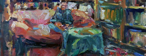 Daarnaast ontwikkelde ik een manier om schilderijen als ruimtelijk object neer te zetten. Bij het 'kistproject' Man met Zonnebloem' ligt een man in een (doods)kist. Slaapt hij? Of is hij dood?