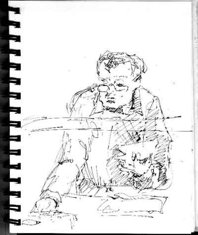 Vergist zich in het bedrag van de haring, rekent een broodje haring, en weet niet hoe hij dat terug moet draaien. Hij krabt zich achter de oren, berekent het dan allemaal maar uit het hoofd, ontvangt ons geld en wenst ons smakelijk eten.