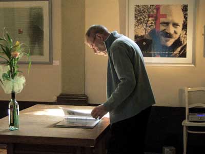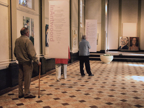 In Antwoord is een kunstproject ontstaan in 2003. Het had als basis een briefwisseling per email. Dat was in die jaren nog niet echt gewoon. Van de dagelijkse beslommeringen van de twee kunstenaars Mieke van Zundert (schilder en vormer) en Ivo Winnubst (schilder en graficus) werd over en weer verslag gedaan. Vincent was het onderwerp, kunst, vorderingen met schilderijen, reageren op elkaars materiaal en verder ging het over het leven in zijn algemeenheid. Het groeiende project werd steeds weer op andere van Goghplaatsen weggezet en steeds waren er nieuwe werken en ontwikkelingen. In Zundert kregen fragmenten uit de brieven alle ruimte ( lay out Ivo Winnubst). De oude Annakapel en alle elementen in de aanpalende ruimten werden zoveel mogelijk ingezet bij de expositie. Het werk wat getoond werd was door de twee kunstenaars verzameld op Van Goghlocaties , of hing qua thema samen met de bespreken onderwerpen. Centraal in iedere expositie stonden de twee manshoge portretten die de kunstenaars van elkaar hebben geschilderd. Ook werd er een postzegel uitgegeven. Bij de opening las Jos Vriends voor uit de brieven Van Gogh. De brief ging over de periode in de Psychiatrische Inrichting in Saint Remy. Jos Vriends had zelf eerder geposeerd bij het schilderfestival. zowel Ivo Winnubst als Mieke van Zundert hadden destijds een portret van hem geschilderd. |